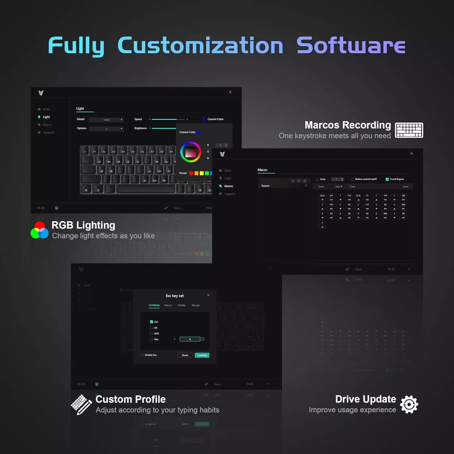 TK63 is an RGB Mechanical Keyboard with 63 keys, durable Double Shot Pudding PBT keycaps, 16.5 million color RGB backlight, anti-ghosting technology, full n-key rollover, able to perform complex executions using our Fn combo. Three modes include Bluetooth 5.0/3.0, 2.4Ghz, USB-C provides more choices for your keyboard.