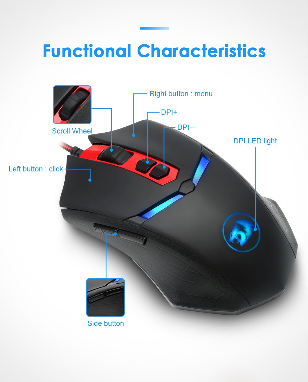 - Different colour backlight of extra buttons on top allows identifying active DPI level with ease