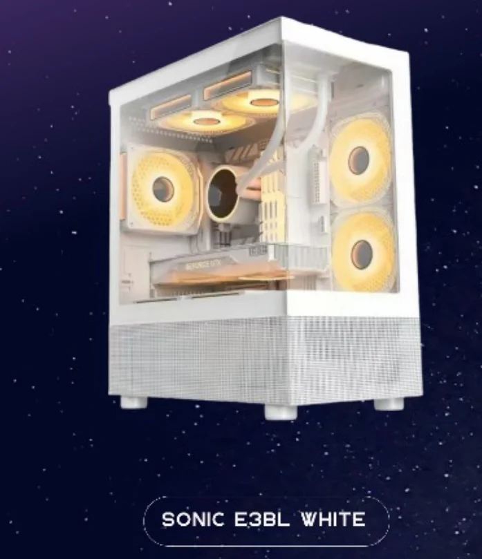 The Sonic E3BL White Gaming Case is a compact and stylish chassis built for small-form gaming or workstation builds. It includes three pre-installed 120mm ARGB fans that provide vibrant lighting effects along with solid airflow to maintain optimal system temperatures. The tempered glass side panel offers a clear view of your components and lighting, adding a premium touch to your setup.