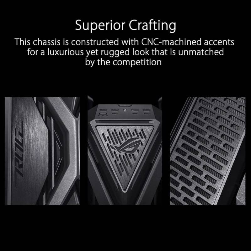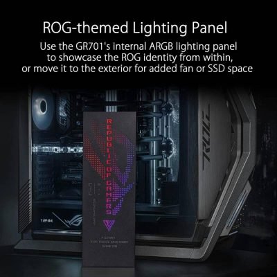 ROG Hyperion GR701 E-ATX computer case, 420 mm dual radiator support, four 140 mm fans, metal GPU holder, component storage, ARGB fan hub, 60W fast charging.